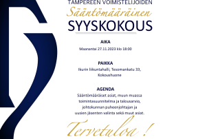 kaisaharjulagmailcom2023-11-19T09:38:44+02:00Tampereen Voimistelijat ry on päättänyt palkata seuran toiminnanjohtajaksi Olli-Pekka Lintulan. Hän aloittaa toimessa 5.12.2023 Olli-Pekka on toiminut aiemmin Espoon Telinetaiturit ry toiminnanjohtajana ja on Suomen Voimisteluliitto ry:n hallituksen jäsen. Hänellä [...]