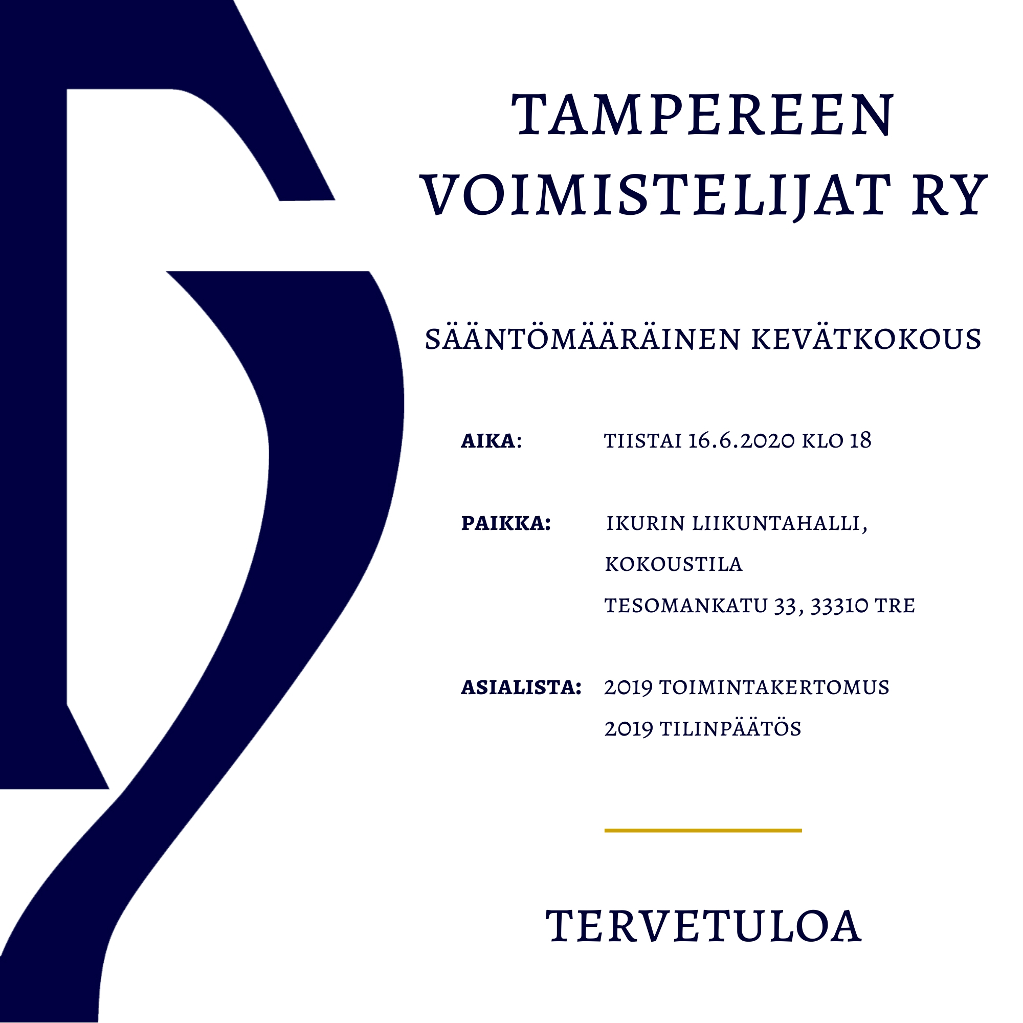 Katso kuvaa isompana SÄÄNTÖMÄÄRÄINEN KEVÄTKOKOUS 16.6.2020 Tampereen Voimistelijoiden sääntömääräiselle kevätkokoukselle on asetettu uusi päivä. Aika: tiistai 16.6.2020 klo 18 Paikka: Ikruin liikuntahalli, Neuvotteluhuone Tervetuloa! Tampereen Voimistelijat ry Johtokunta tampereenvoimistelijat2020-06-02T10:32:07+03:00 Kerro kaverille tai jaa somessa! FacebookTwitterPinterestSähköposti