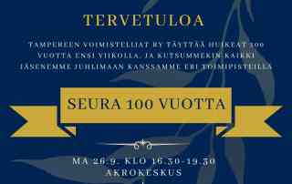 tampereenvoimistelijat2022-09-24T16:16:53+03:00Tampereen Voimistelijat ry täyttää huikeat 100 vuotta ensi viikolla 26.9., ja kutsummekin kaikki jäsenemme juhlimaan kanssamme eri toimipisteillä. Tervetuloa siis koko perheen voimin nauttimaan kakusta ja hilpeästä tunnelmasta! Viikolla [...]
